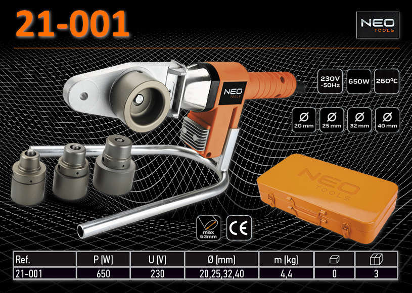 Аппарат NEO для сварки полимерных труб PE, PP, PB, мощностью 650 Вт, предназначен для сварки муфт, труб и фасонных элементов диаметром до 40 мм. Продается в комплекте с 4 насадками диаметром 20, 25, 32, 40 мм. Насадки с PTFE-покрытием, увеличивающим срок их службы. Температура рабочей головки 260°C гарантирует эффективную работу. Набор упакован в удобный чемоданчик. Соответствие европейским стандартам в области безопасности подтверждает сертификат CE. Гарантией высокого качества и надежности инструмента является сертификат TÜV Rheinland.